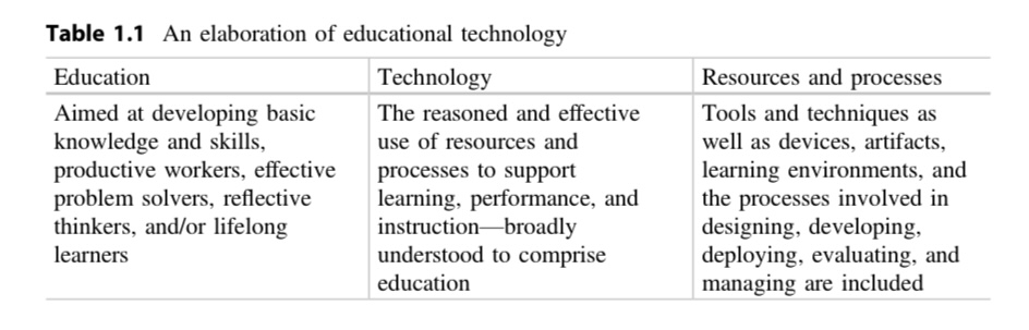 “designing, adapting, customizing, implementing, testing, deploying, and evaluating resources, activities, and learning and instructional tools intended to facilitate learning, performance, and instruction are included within the scope of the discipline” (Chapter 1, P8). and Table 1 (Chapter 1, P10).